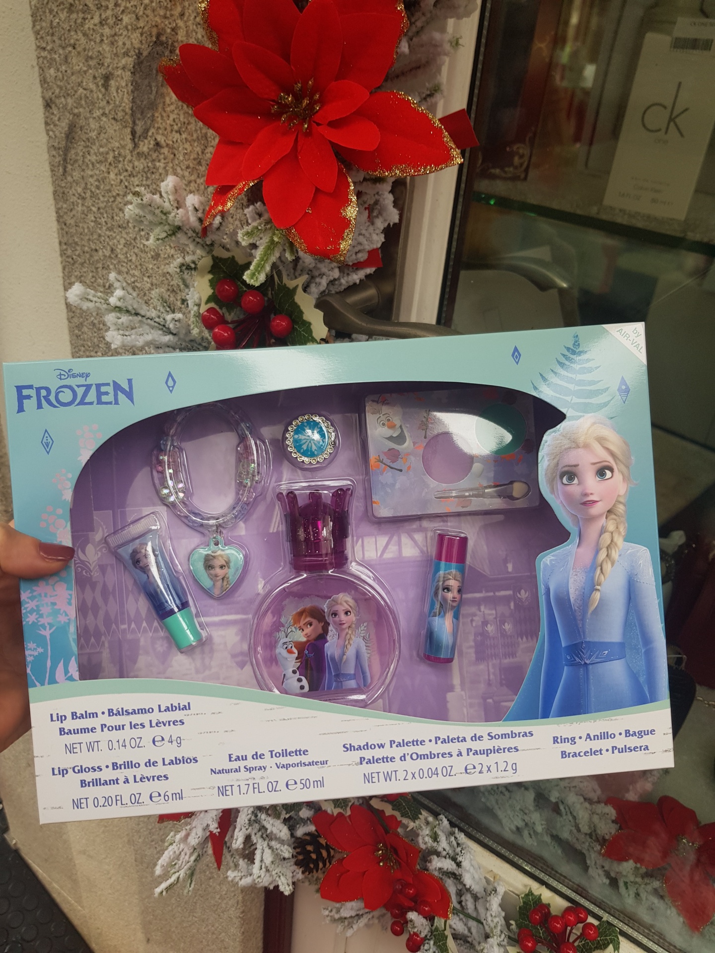 O conjunto de caixa Frozen inclui uma fragrância frutada em formato de 50 ml, um kit de maquilhagem com sombras de olhos e batons, uma pulseira e um anel - o presente perfeito para as verdadeiras princesas!