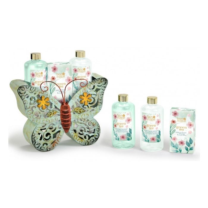 Desfrute de um momento de relaxamento com o encantador Conjunto de Banho Metal Borboleta LORENAY. Este conjunto, decorado com uma borboleta metálica em cores vibrantes, é perfeito para presentear ou cuidar de si mesma. Cada produto deste conjunto é delicadamente perfumado com a suave fragrância de Chá Verde Bon Matin. Inclui um Gel de Banho Hidratante de 300 ml, um Leite Corporal Hidratante de 300 ml e um Sabonete de Toalete de 100 gramas.