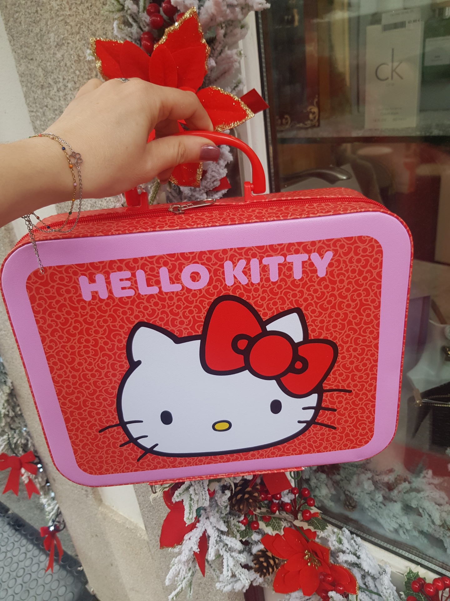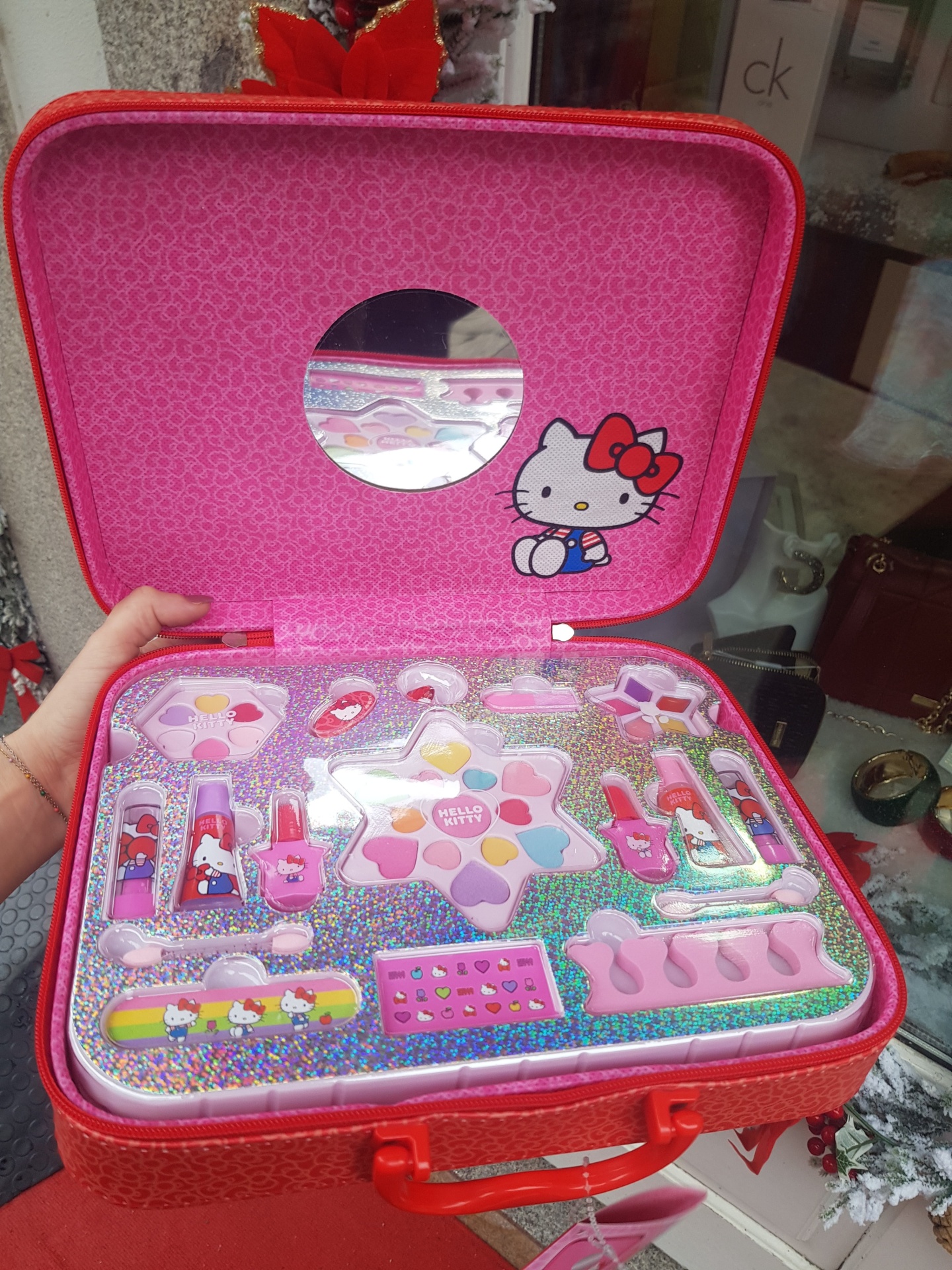 A bolsa de maquilhagem quadrada da Hello Kitty é a escolha perfeita para dar asas à imaginação. Inclui paletas de brilhos labiais, sombras de olhos em pó e em creme, blush, batons e brilhos labiais, além de verniz para as unhas, lima de unhas, set de autocolantes para as unhas, separador de dedos, gancho de cabelo e anel. O seu design robusto com pega torna-a fácil de transportar.