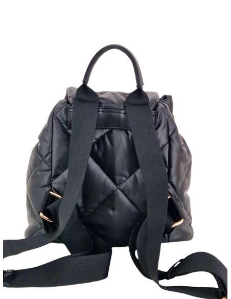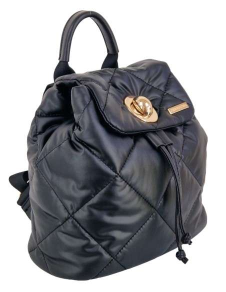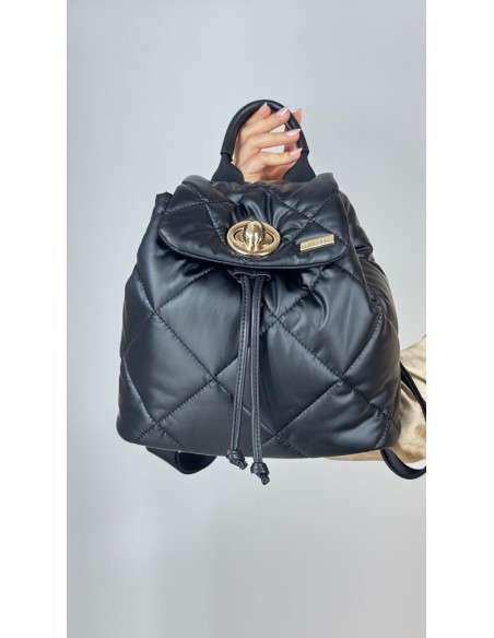 Duas cores Preto e Gelo, confecionada em material sintético acolchoado, esta mochila se destaca pelas suas costuras detalhadas e uma elegante pala frontal com um chamativo fecho grande dourado. Ideal para o dia a dia, eventos ou para adicionar um toque de luxo a qualquer visual