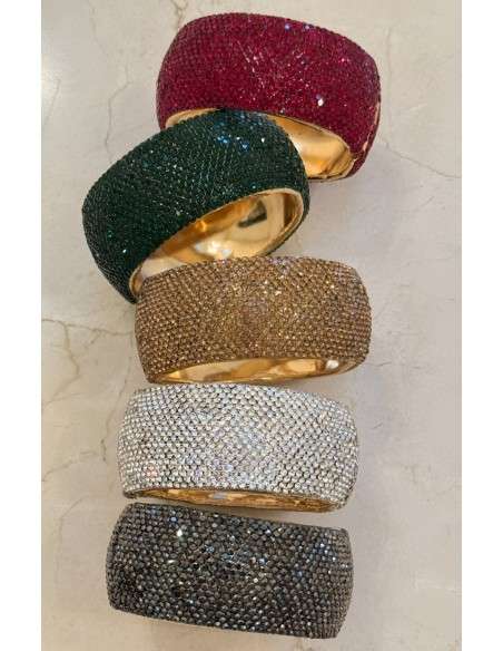 Estas pulseiras são perfeitas para dar um toque de brilho ao seu look. Disponíveis numa variedade de cores vibrantes, são adornadas com inúmeras pedras cintilantes que captam a luz e garantem que se destaque. A estrutura dourada no interior confere-lhes um acabamento luxuoso e elegante.