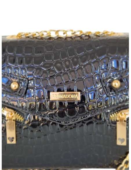 Este tiracolo Primadona com um toque premium é um acessório sofisticado e versátil, perfeito para adicionar um toque de glamour a qualquer look. Fabricada em pele sintética com efeito croco, esta mala destaca-se pelos seus detalhes em corrente dourada e fechos decorativos no mesmo tom, que realçam o seu design elegante. Disponível em preto e vinho.
